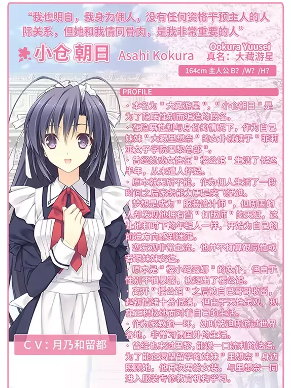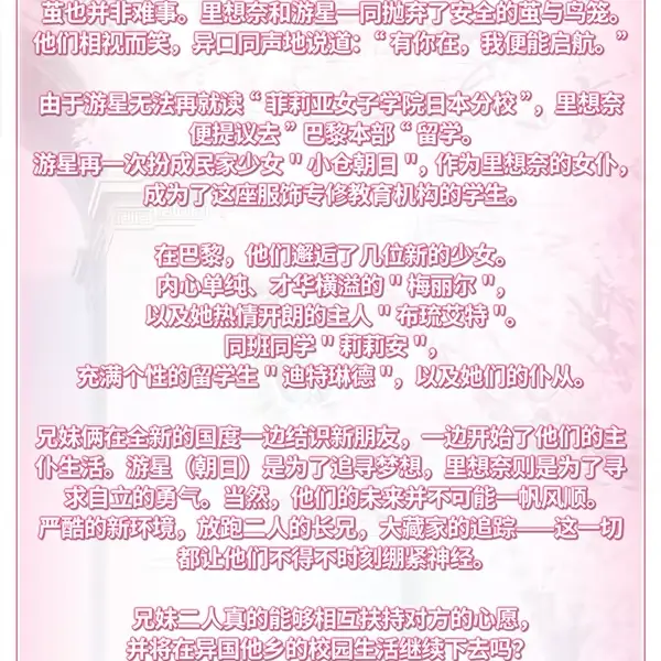 《少女理论及其周边 -École de Paris-》是日本美少女游戏资深大厂Navel制作的超人气女装作品《近月少女的礼仪》的续作。讲述了前作主人公大藏游星为了陪同自己的妹妹里想奈前往巴黎留学而再次扮演小仓朝日成为女仆所展开的全新故事。本作曾在美少女游戏大赏荣获综合第3,剧本第1,作画第5等诸多奖项。