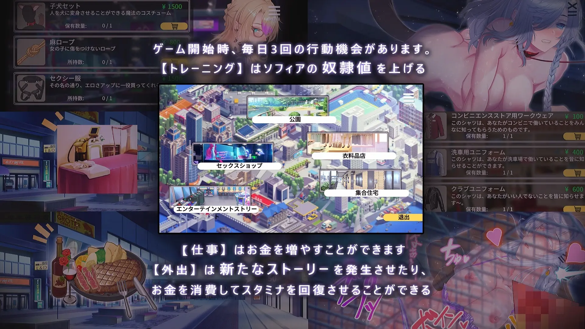 【性爱事件】的触发需要索菲亚的奴隶值,但游戏内的部分CG,需要与其他条件如道具或天数等组合才能解锁。与索菲亚女儿的【性爱事件】,在解锁第三个新工作后便会触发,请加油吧!