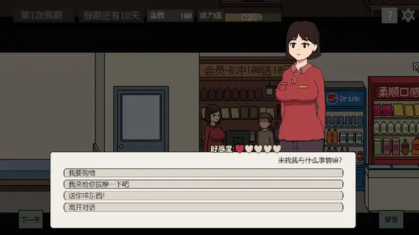 假期中,你可以自由穿梭于你所待在的公寓中,自由访问楼内住户,与其互动或赠送他们礼物,获得她们的好感度。